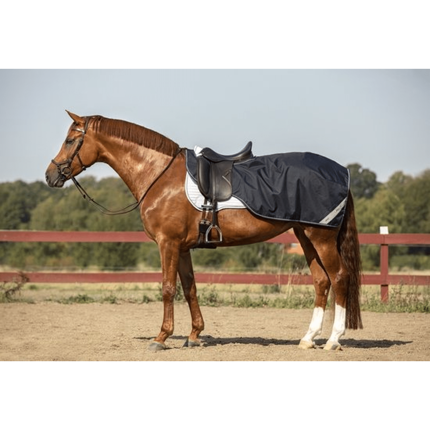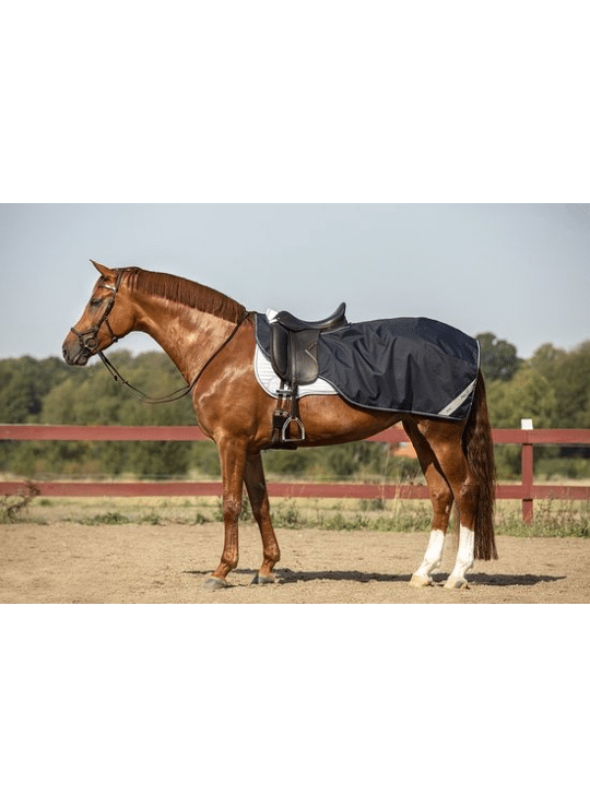 De deken is voorzien van een zachte fleecevoering en een praktische snelsluiting met klittenband bij de schoft. Dankzij de ruime, gebogen pasvorm valt de deken netjes om het zadel zonder de hulpen van de ruiter te hinderen, terwijl hij goed op zijn plaats blijft. De bilkoorden zorgen ervoor dat de rug en achterhand van het paard warm en beschermd blijven tegen weer en wind.
