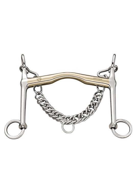 Dressuurstang HO. 14mm dik. Materiaal Sensogan met RVS scharen. Dit unieke mondstuk is licht naar voren gekanteld en afgerond voor een evenredige verdeling van druk op de tong. De HO stang werkt optimaal in op de tong voor ultieme verfijning van de teugelhulpen. Zeer geschikt voor de overgang naar stang & trens. Scharen 7cm. Heeft een grote, maar vertraagde inwerking achter de oren door de lange scharen.
