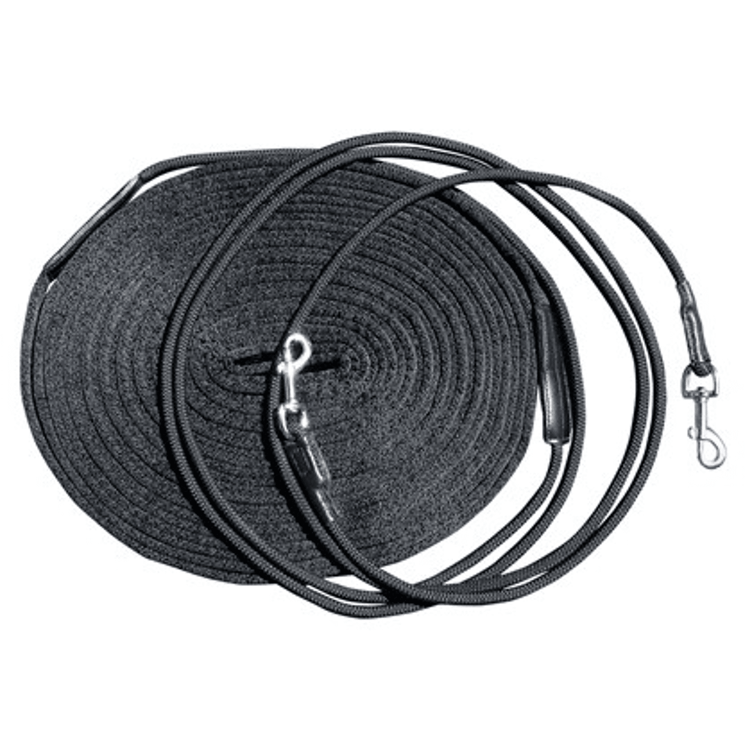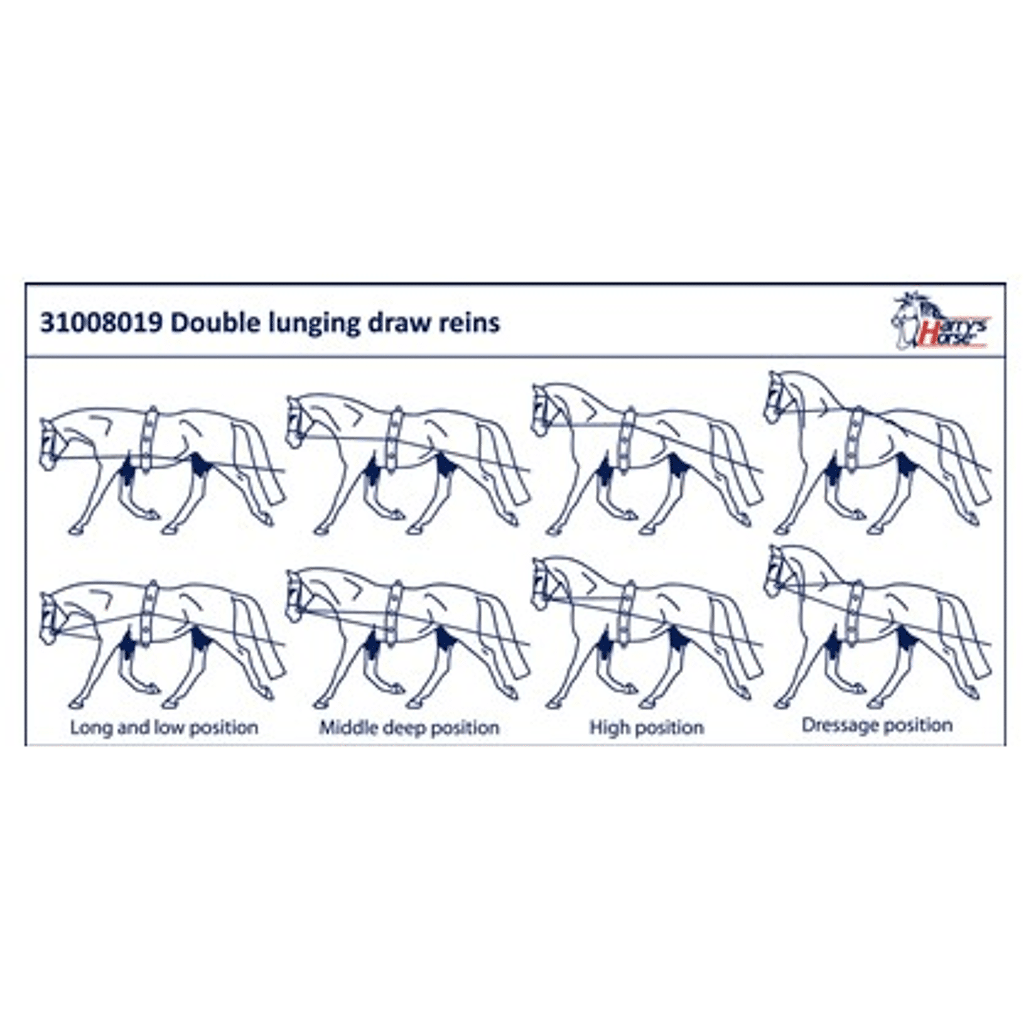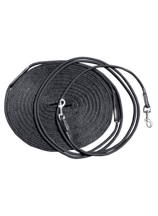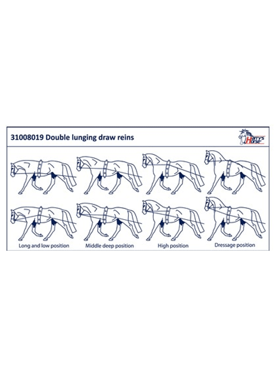 Dubbele longeerlijn bestaat uit twee ronde koorden, te bevestigen aan debitringen door middel van twee zilverkleurige muskatonnen. Daarna gaat dit overin een plat, soft webbing lijn.