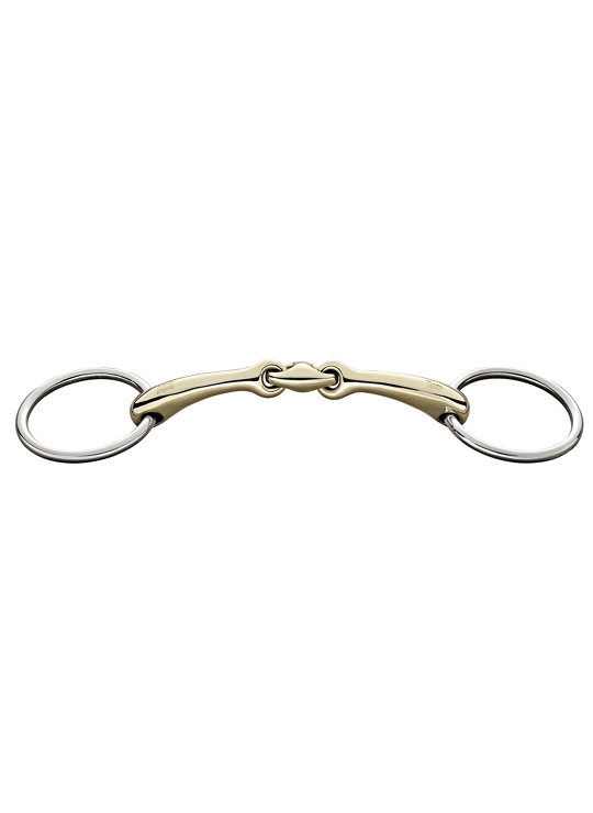 Dubbelgebroken Dynamic onderleg watertrens. 14mm dik. Materiaal Sensogan met RVS ringen. De ergonomische vorm zorgt voor een zachte en evenredige verdeling van druk. Het middenstuk is 45 graden gekanteld, waardoor het bit optimaal op de tong komt te liggen. Stimuleert de aanname van het bit. Geschikt voor gevoelige paarden of paarden met een dikke tong.