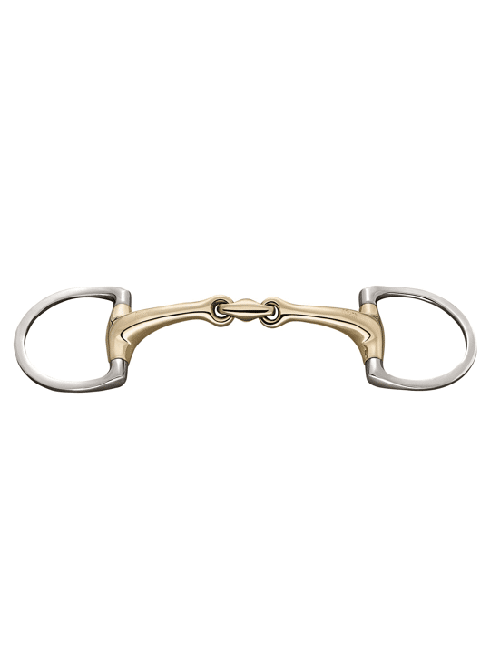 Dubbelgebroken Dynamic D-ring vorm trens. 16mm dik. Materiaal Sensogan met RVS ringen. De ergonomische vorm zorgt voor een zachte en evenredige verdeling van druk. Het middenstuk is 45 graden gekanteld, waardoor het bit optimaal op de tong komt te liggen. Stimuleert de aanname van het bit. Geschikt voor gevoelige paarden of paarden met een dikke tong. Ligt stabiel in de mond door de zijdelingse begrenzing van de vaste ringen.