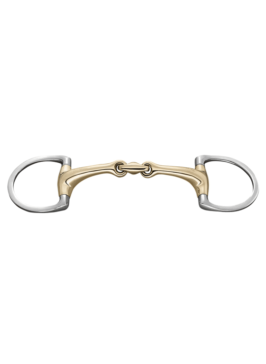 Dubbelgebroken Dynamic D-ring vorm trens. 14mm dik. Materiaal Sensogan met RVS ringen. De ergonomische vorm zorgt voor een zachte en evenredige verdeling van druk. Het middenstuk is 45 graden gekanteld, waardoor het bit optimaal op de tong komt te liggen. Stimuleert de aanname van het bit. Geschikt voor gevoelige paarden of paarden met een dikke tong. Ligt stabiel in de mond door de zijdelingse begrenzing van de vaste ringen.
