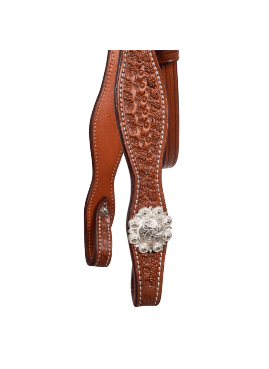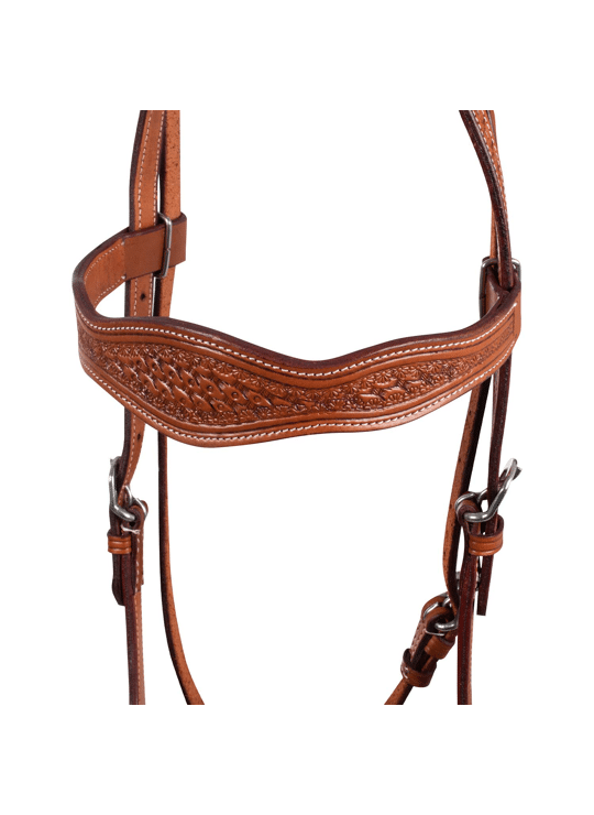 Westernhoofdstel met frontriem, voorzien van basket tooling en zilveren details. Door de frontriem is dit hoofdstel geschikt voor gebruik in combinatie met een trens bit.