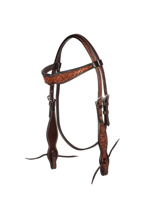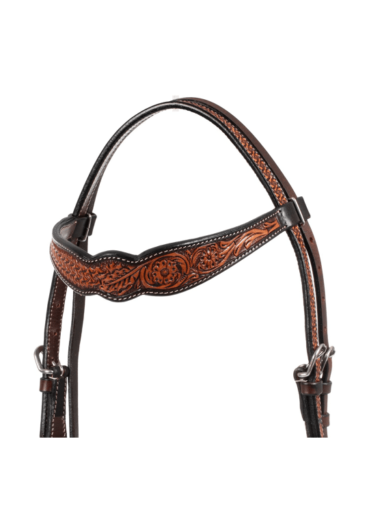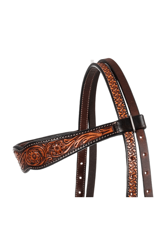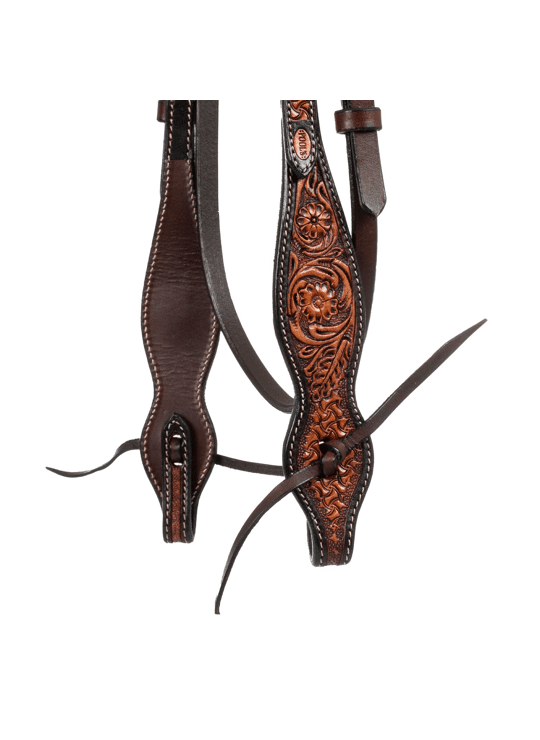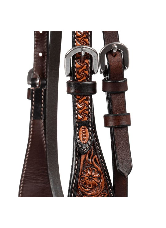 Westernhoofdstel vervaardigd uit hoge kwaliteit leder. Het leer bevat flower tooling en er is gebruik gemaakt van roestvrijstalen gespen.