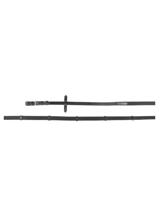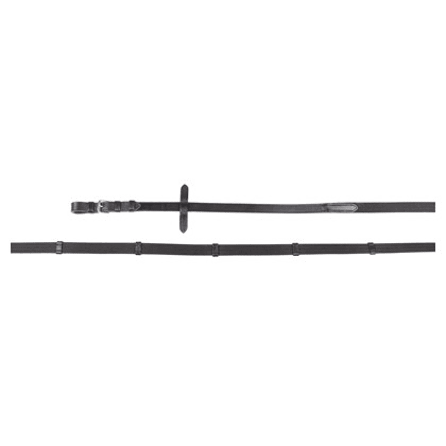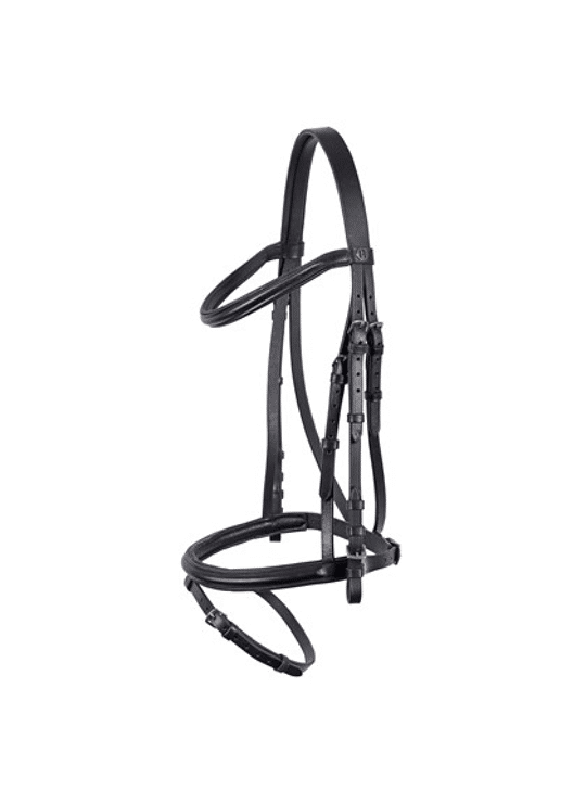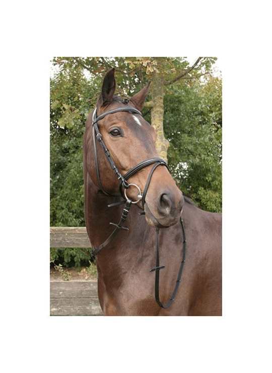 Lederen hoofdstel met gecombineerde neusriem met zwarte padding, RVS gespen en webband teugels met stops.