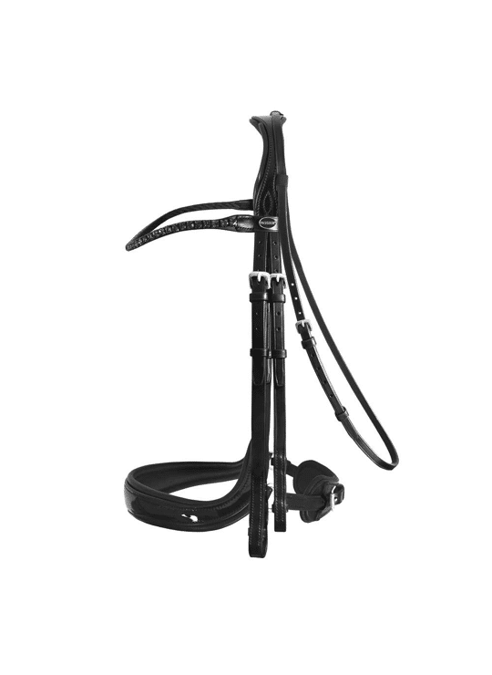 De zacht gevoerde neusriem met glanzend lakleer biedt extra ruimte voor het jukbeen en de aangezichtszenuw, waardoor drukpunten worden verminderd.