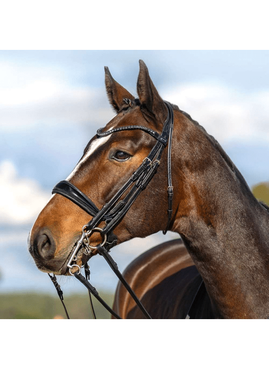 Het elegante Passier Moonlight stang en trens hoofdstel combineert een luxe uitstraling met optimaal comfort voor het paard. Het hoofdstel is voorzien van een anatomisch gevormd kopstuk dat zacht is gevoerd en een uitsparing heeft bij de halswervel. Daarnaast zorgt de extra zachte vulling bij het gevoelige oorkraakbeen voor een comfortabele pasvorm.