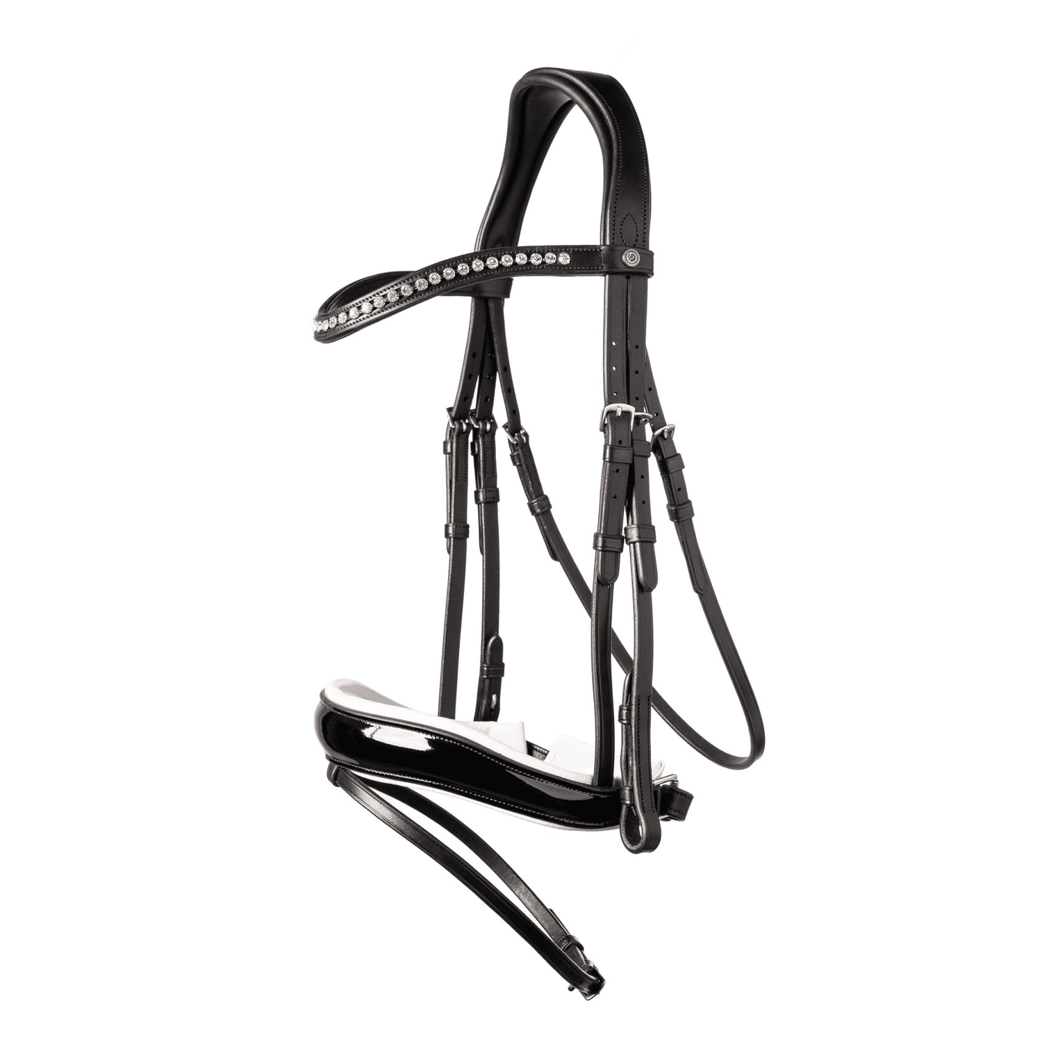 Het dressuurhoofdstel TRUST Rotterdam is een prachtig hoofdstel met een brede lakneusriem. De neusriem is voorzien van een super zachte padding voor extra comfort. De aansnoer van de neusriem is met nylon onderlegd. Hierdoor kan de neusriem niet uitrekken en blijft de pasvorm perfect. De uiteinden van de neusriem zijn versmald, wat zorgt voor meer vrijheid bij het bit. Ook loopt de neusriem in het midden omhoog. Dit maakt de neusriem dubbel anatomisch. Daarnaast heeft de sperriem een buckle protector waardoor de gesp nooit de neus van het paard raakt. De frontriem is voorzien van de zuiverste kwaliteit Stellux™ steentjes wat zorgt voor een elegante uitstraling. Deze steentjes zijn deep-set, waardoor ze er niet uitvallen. Ook de frontriem is ligt gebogen. Het kopstuk is anatomisch gevormd en teruggesneden voor meer vrijheid bij de oren. De padding van het kopstuk is zacht maar niet te dik zodat er direct contact is met paard.