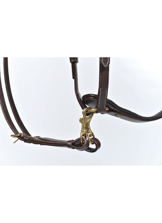 Jachtmartingaal in buffelleder met 3-punts systeem. Deze jachtmartingaal is gemaakt met snelle bevestiging aan de singelstoten die er meteen ook voor zorgen dat het zadel beter gepositioneerd blijft en dankzij de elastiek is de bewegingsvrijheid van het paard gegarandeerd.