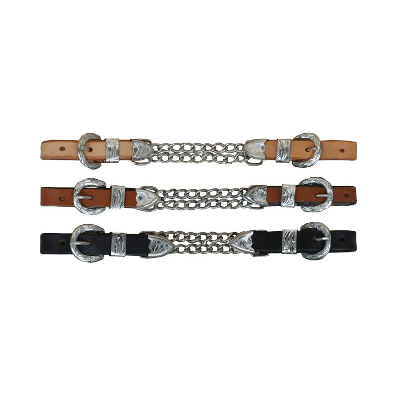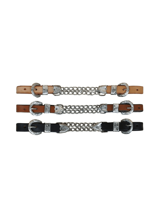 Leren showketting met twee verzilverde gespen, geschikt voor alle gangbare bitten. Deze showketting is zowel visueel als functioneel perfect voor shows! De ketting is verkrijgbaar in drie verschillende kleuren.
