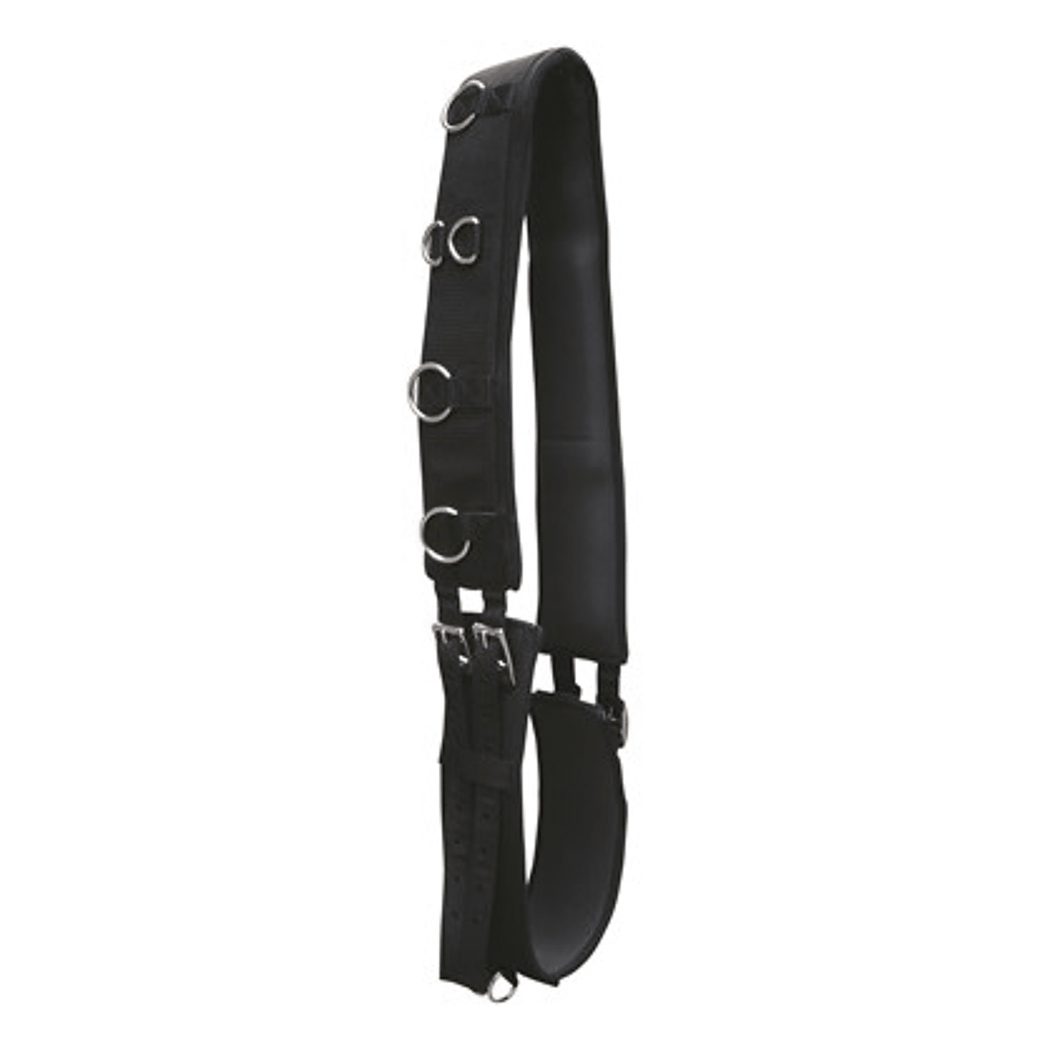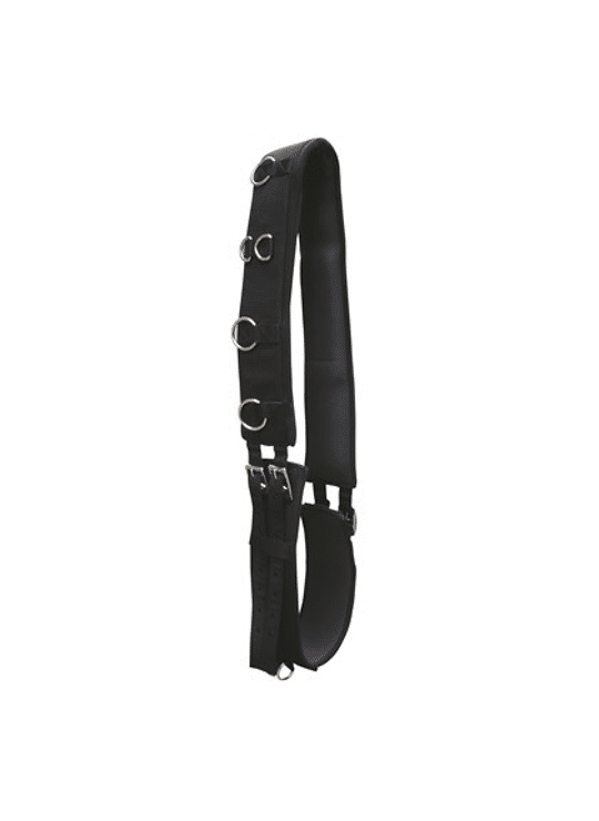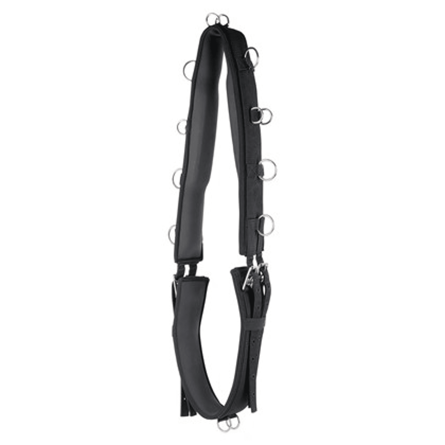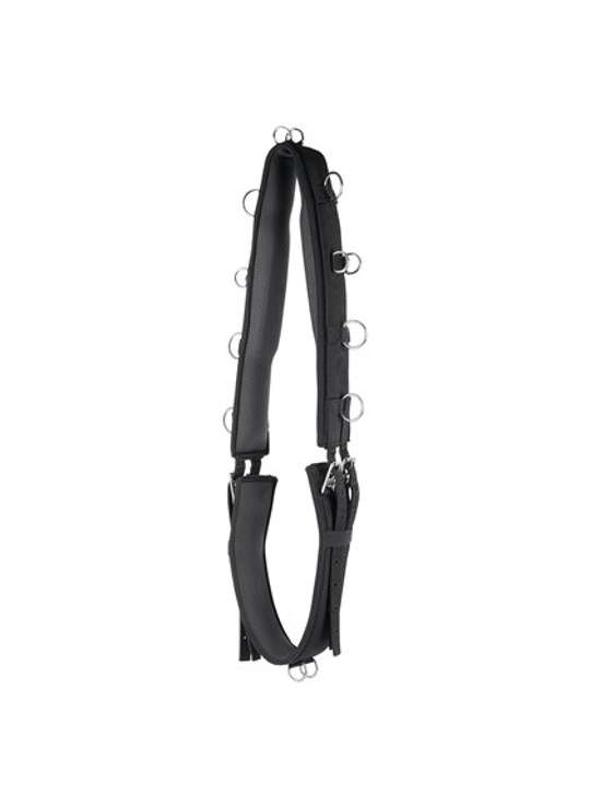 Luxe longeersingel met neopreen voering. De longeersingelis voorzien van 12 ringen waarvan 2 ringen aan de onderkant. Aan beide kantenverstelbaar door middel van rolgespen.