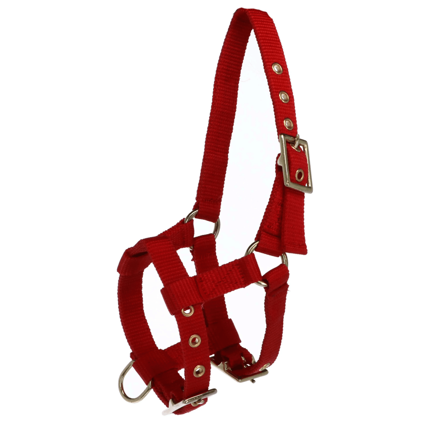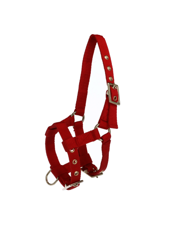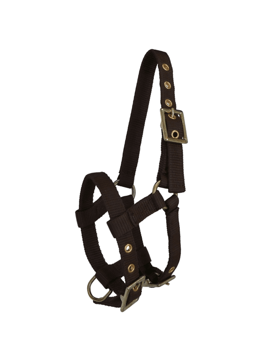 Halster van tweelagig polypropyleen met neusriem. Halsriem en kopstuk volledig verstelbaar met gespen. Voorzien van metalen rijggaten en geel metalen gespwerk.