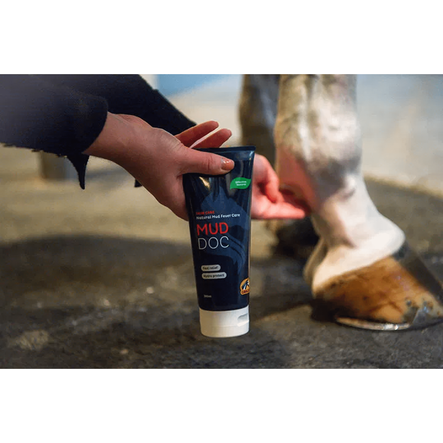 Cavalor MudDoc werkt heel snel door de unieke combinatie van verschillende essentiële oliën waaronder aloë vera, lavendel, eucalyptus en tea tree. Cavalor MudDoc is zeer veelzijdig in de behandeling van mok. De antiseptische eigenschappen maken van de kootholte een onaangename omgeving voor de bacteriën die mok veroorzaken, terwijl de wondhelende en pijnstillende eigenschappen het welzijn van het paard verbeteren. Bovendien wordt ook de bloedcirculatie gestimuleerd waardoor de wonden sneller genezen. Tenslotte zal de hydraterende crème ook de elasticiteit van de huid verbeteren waardoor minder littekenweefsel gevormd zal worden en het haar sneller terug zal groeien. De huid soepel houden is belangrijk om kloven te voorkomen. Die komen immers vaak voor tijdens intensieve arbeid zoals jumping.