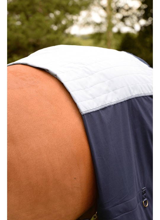 Deze deken heeft een T-haak voorsluiting met magneten die wordt afgedekt met klittenband. De schouderplooien geven het paard veel schouder- en bewegingsvrijheid. Deze zorgt er in combinatie met de buiksingels en het bilkoord voor dat de deken goed blijft liggen op de rug van het paard. Heeft klittenband sluitingen voor bij de hals en achter bij de ogen van de bilkoorden zodat je deze deken perfect vast kunt maken aan een buitendeken waar ook een hals aan bevestigd kan worden.