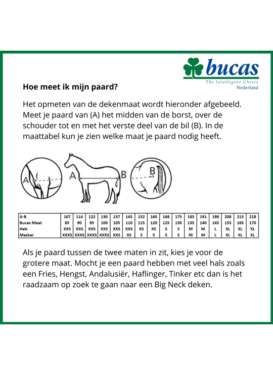 Ons advies is om altijd je paard op te meten voordat je overgaat tot aankoop. Een deken moet correct liggen om schuiven van de deken, scheeftrekken en schuur plekken te voorkomen. Dit voorkomt teleurstellingen over de aanschaf van jouw deken. Koop je deken niet te groot, meten is weten.
