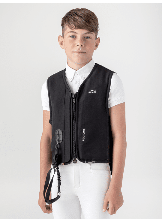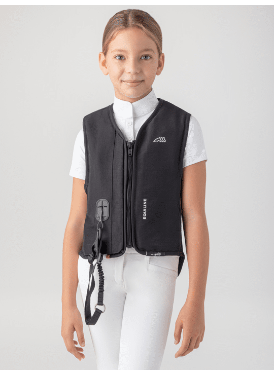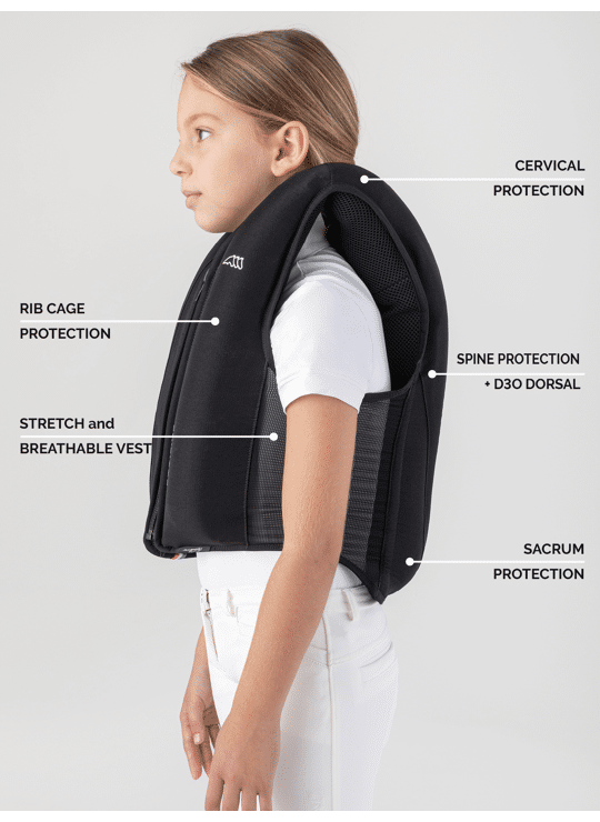 Het vest heeft een mechanisch releasesysteem via kabel en is herbruikbaar door de CO₂ cartridge te vervangen. Het beschermt tegen hyperflexie en hyperextensie, met focus op de rug, borst en heupen. De voorzijde heeft een praktische rits, en het vest is voorzien van een D3O Level 1 rugprotector, ideaal voor jonge ruiters.