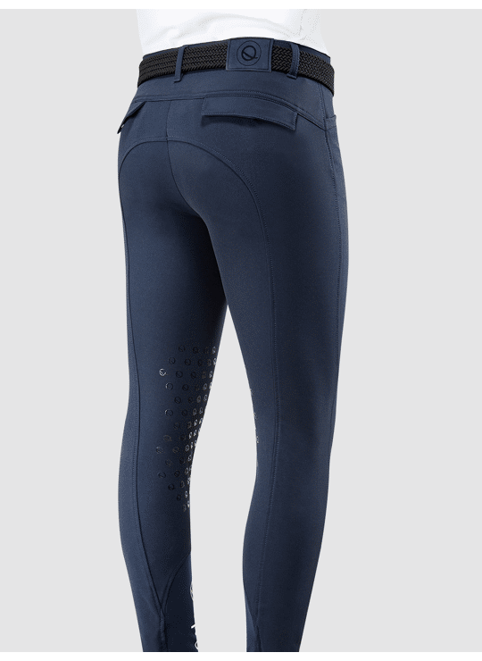 Sportieve rijbroek voor heren met Eqode 'Q' siliconen kniegrip. De rijbroek heeft twee voorste steekzakken en een logo-print aan de zijkant. Het heeft een uitstekende pasvorm en is gemaakt van ademende stretchstof.