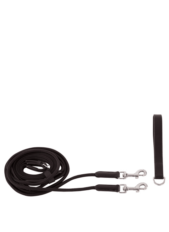 De uiteinden van deze slofteugel zijn vervaardigd van nylon koord (8 mm breed). Het voordeel van koord is, dat het makkelijker door de bitringen glijdt. De teugelgedeelten zijn gemaakt van webband met ingeweven rubber (14 mm breed). De koorden uiteinden worden met behulp van twee musketonhaken vastgemaakt aan de singel. Als de singel niet over een bevestigingsring beschikt, kan de meegeleverde lederen singellus met D-ring gebruikt worden. De slofteugel is uitgerust met glanzende, zilverkleurige fournituren van verchroomd messing. Een slofteugel wordt gebruikt om een juiste hoofdhouding te verkrijgen. Als het paard het hoofd te hoog houdt, zal de slofteugel inwerken en druk geven op het bit. Als het paard nageeft, zal de druk afnemen. Maat Cob: 0,95 m teugel + 1,125 m koord = 2,075 m (4,15 m totale lengte) Maat Full: 1,3 m teugel + 1,2 m koord = 2,5 m (5 m totale lengte)