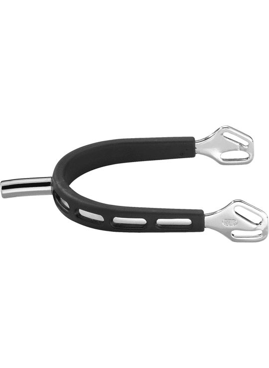 Ultra fit GRIP sporen met Balkenhol systeem en rubber rond de spoor voor extra bescherming voor de laars. Recht uiteinde, 25mm. Het Balkenhol systeem geeft een unieke pasvorm en design. De sporenbandjes worden in een hoek van 45 graden door de spoor heen gehaald. Door een speciale uitsparing aan de binnenkant van de bevestiging sluit het druk op de enkel en voet van de ruiter uit en blijft de spoor altijd netjes op zijn plek.