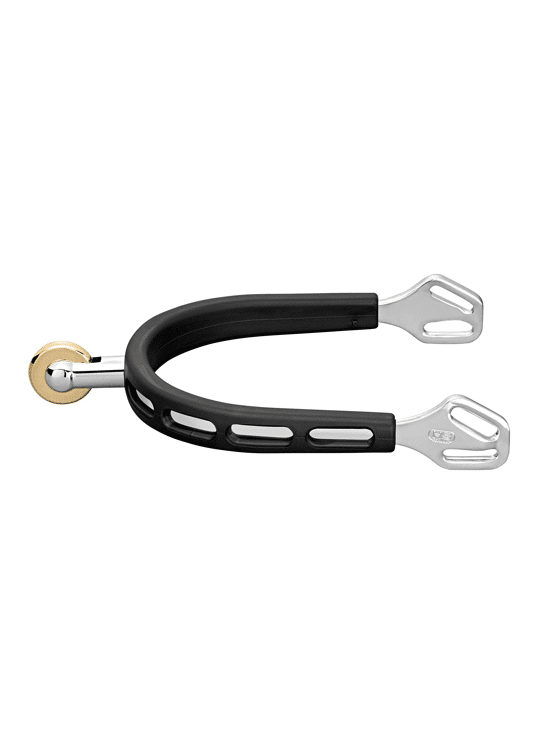 Ultra fit GRIP sporen met Balkenhol systeem met verticale Comfort Roller. 25mm. Het Comfort Roller wieltje is iets dikker en zachter afgerond dan reguliere wieltjes. Dit zorgt voor een zacht contact met de flank zonder de huid en de vacht te beschadigen.
