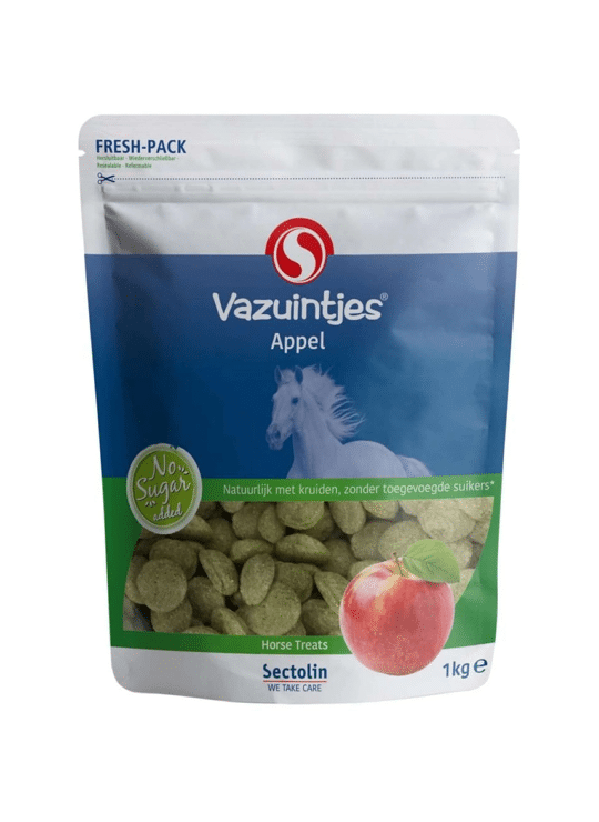 Vazuintjes Appel zijn smakelijke paardensnoepjes op basis van luzerne, kruiden en een heerlijke appelsmaak. Vazuintjes Appel is een aanvullend diervoeder voor paarden.